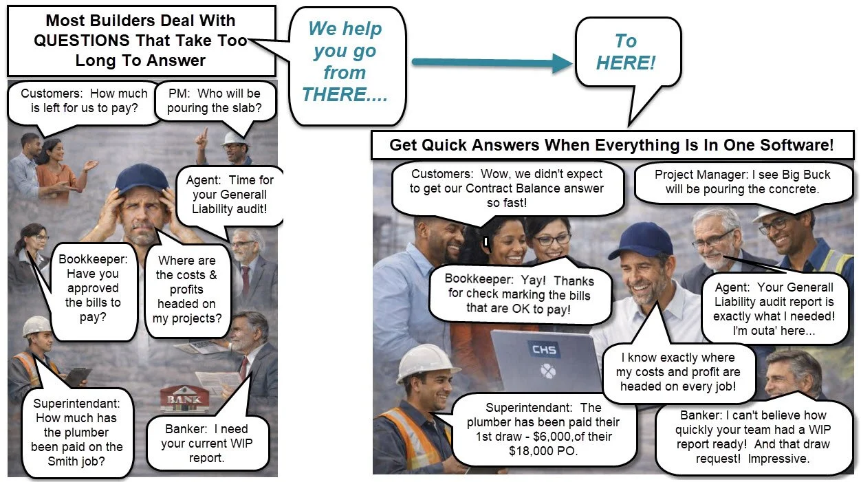 Monitor & Predict where all of your job costs, gross profits, & contract balances are heading every day for every project. CHS keeps your entire team AND your customers informed in real-time! High end custom builders rely on CHS for clarity, control, and client-ready financials.